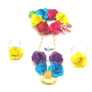 The elegant and ethnic necklace is delicately handcrafted with gotta patti. a base of red/green and multicolor this is perfectly complete your ethnic indian wear outfits as well. Products can be customising according to your requirement in different colours and the number of pieces will be manufactured according to the demand. Set includes 1 Necklaces and and hathphool for Laddu Gopal.