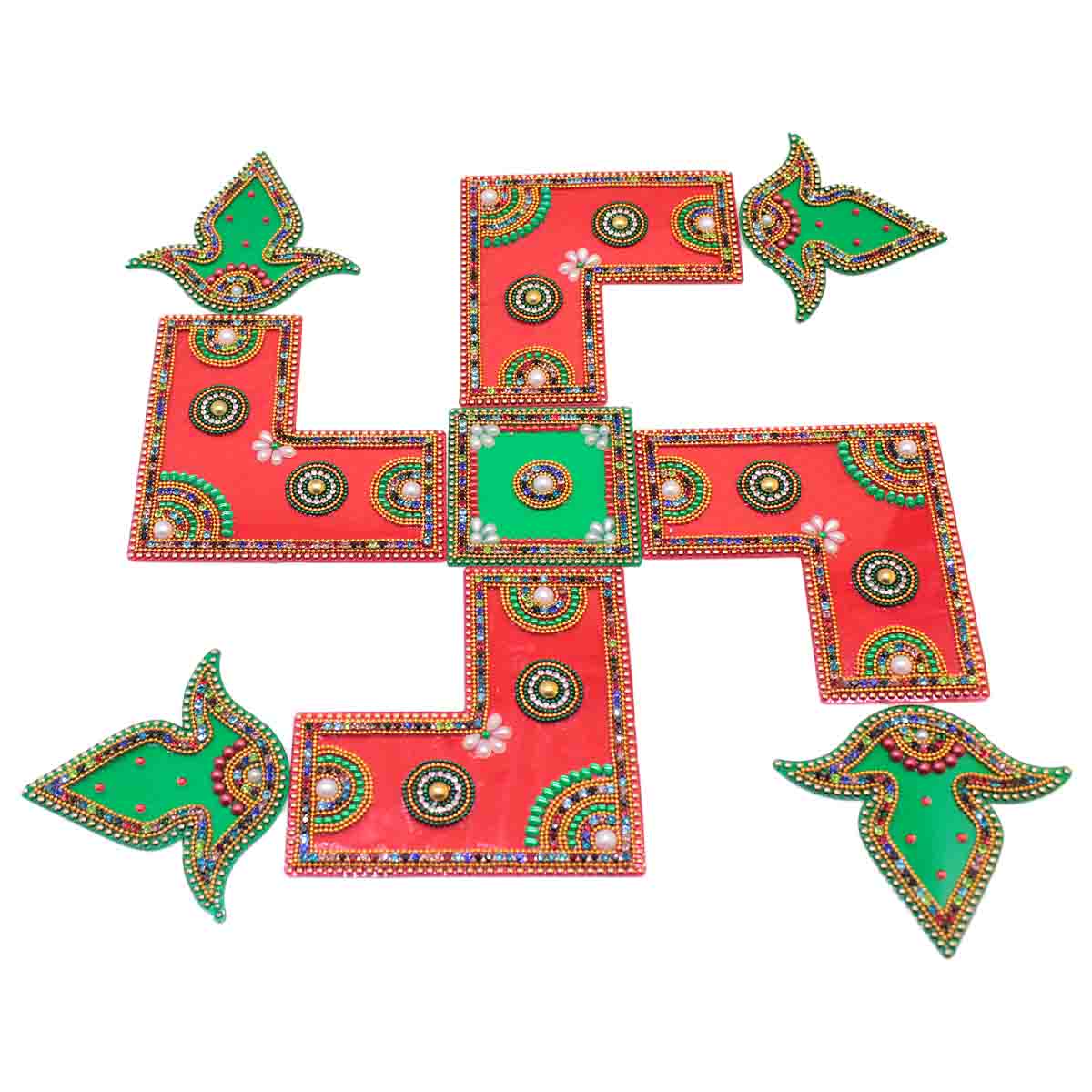 Handmade Multi Design Decorated Rangoli 9 Pieces Set ( Red & Green )