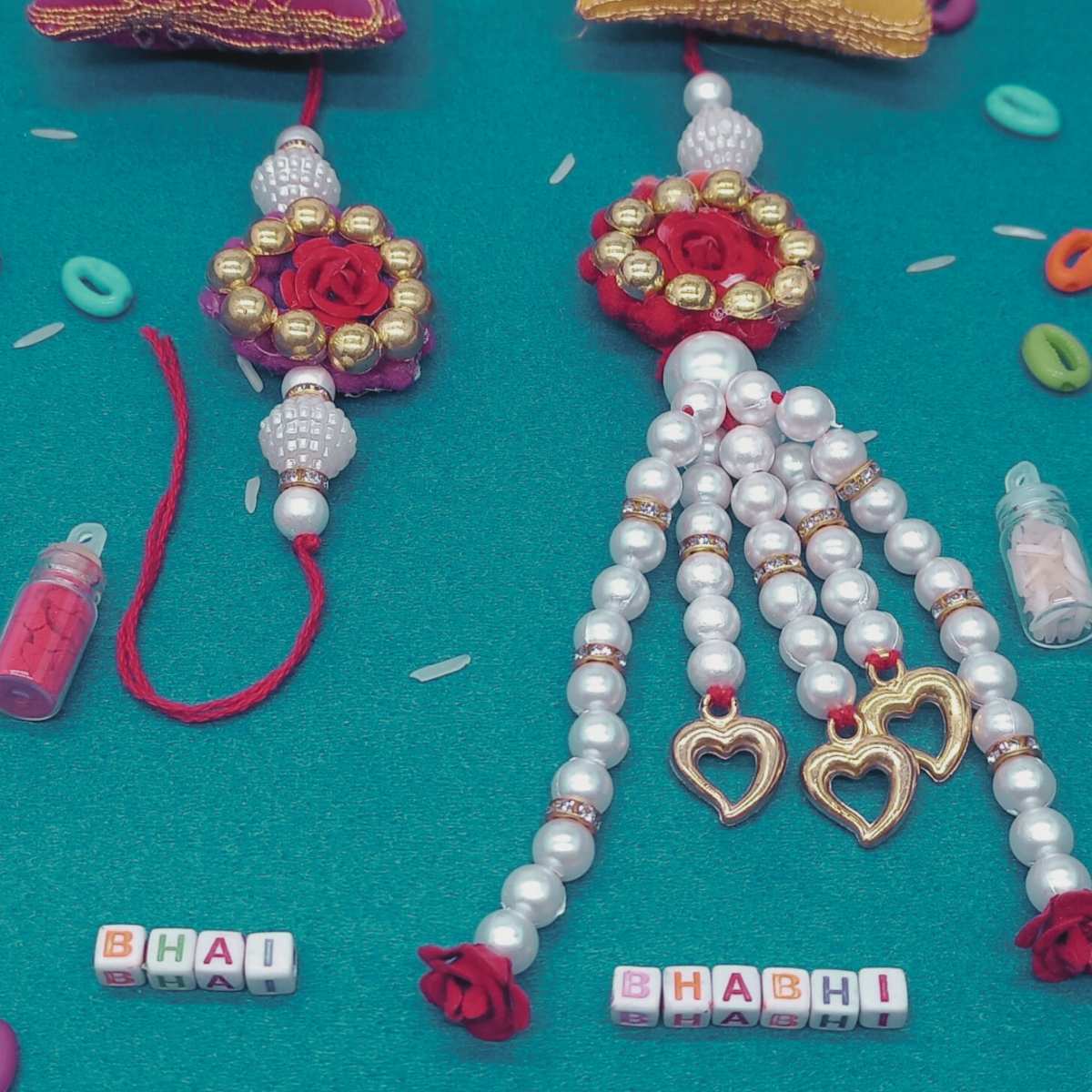 Rakhi for Bhai and Bhabhi (Lumba) with Roli Chawal bottle