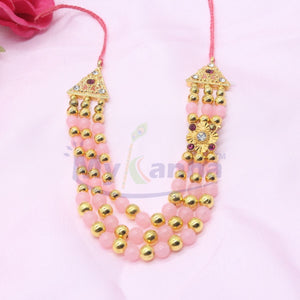 Add elegance to your Laddu Gopal Ji’s attire with this beautifully handcrafted Pink Beaded Triple Layer Haar. Designed with glossy pink and golden beads, adorned with stone-studded triangular ends and a central floral motif, this haar enhances the charm of your deity.