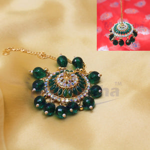 This stunning decorative chhattar is intricately crafted with sparkling beads, surrounded by dazzling stones and golden detailing. It features a hanging chain, making it ideal to suspend over Laddu Gopal or deity idols. The blend of deep green and gold gives it a royal and festive appeal.