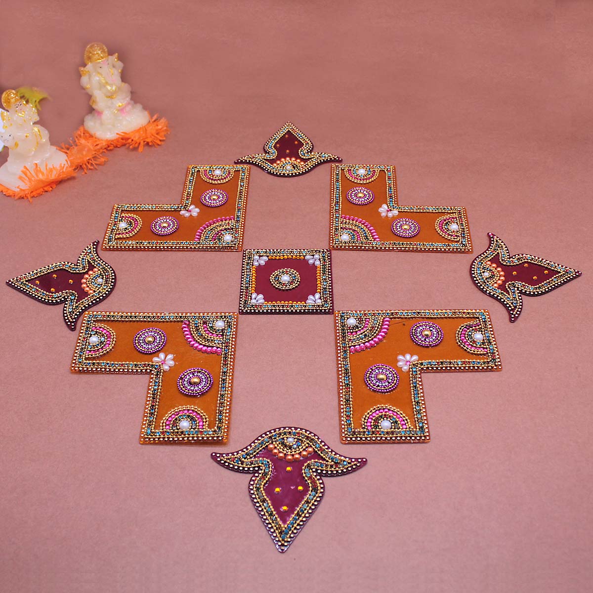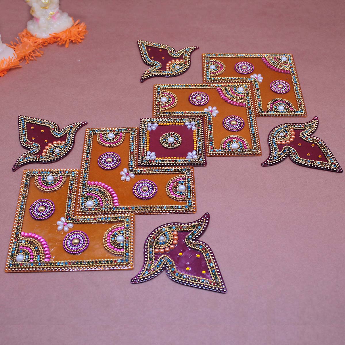 Multi Design Rangoli 9 Pieces Set ( Orange & Red )